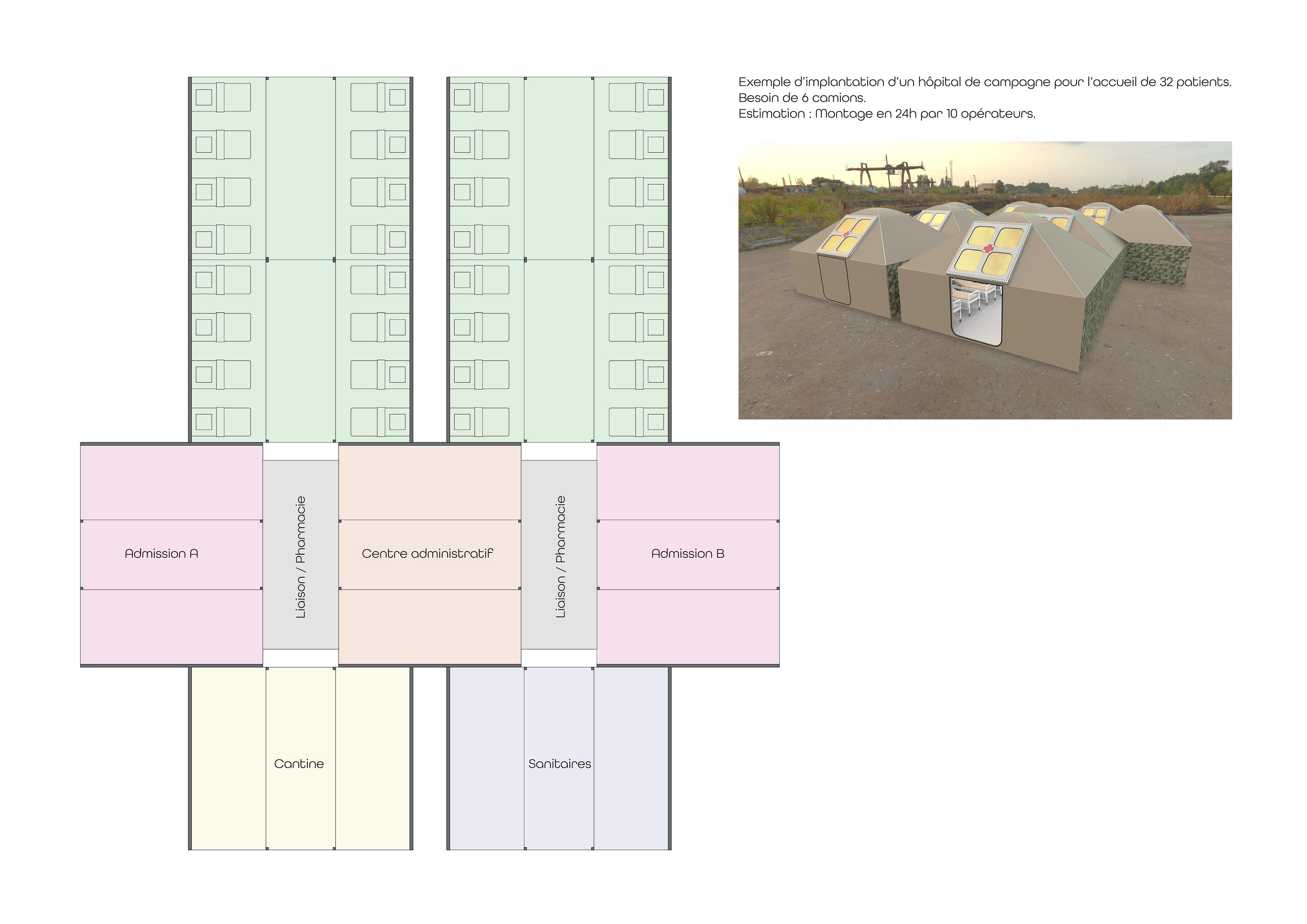 Annoncée par le président Macron le 16 Mars 2020 pour faire face à la crise du COVID-19, la mise en place d’un hôpital de campagne à proximité du CHU de Mulhouse aura nécessité l’intervention de 16 camions et d’une centaine de militaires durant huit jours pour permettre l’accueil de 30 lits de réanimation dans des tentes au confort rudimentaire. Surpris par ce constat, nous avons décidé de mettre à profit nos compétences et notre temps pour imaginer ce que pourrait devenir l’hôpital de campagne de demain avec pour objectifs : - Une mise en oeuvre facile et rapide en milieu urbain, péri-urbain ou sur les théâtres d’opérations militaires avec des moyens de manutention simples et répandus dans le civil ou l’armée. - Un confort et une ergonomie des locaux accrus : luminosité (éclairage naturel et artificiel), ambiance thermique quelle que soit la saison, ventilation naturelle et mécanisable. - De meilleures conditions d’hygiène avec un choix des matériaux et surfaces facilitant l’entretien des locaux et la désinfection. - Une gestion intégrée des énergies, de l’informatique et de la télécommunication. - Une adaptabilité, de la médecine de guerre jusqu’à la couverture ponctuelle d’évenements. - Une conception de type militaire, solide et pérenne. - Un bilan écologique responsable. La pluridisciplinarité de notre équipe nous a permis de nourrir le projet dans une démarche que nous avons souhaitée réaliste et orientée vers l’usage. Le concept Mod’HOP! répond directement à la réalité sanitaire, économique et écologique mondiale. D’un point de vue économique, malgré sa conception innovante qui nécessiterait un investissement conséquent pour aboutir à un produit opérationnel et dont le coût resterait élevé, on peut imaginer que cet investissement soit très rapidement rentabilisé par le besoin limité en main d’oeuvre et véhicules que sa mise en place implique à chaque déploiement. De plus, son adaptabilité permettrait une utilisation fréquente et sans stockage long entre deux crises (déploiement en couverture d’événements sportifs ou culturels par exemple). D’un point de vue sanitaire, face aux situations d’urgences impliquant une installation de ce type d’équipement, chaque jour de mise en place gagné est infiniment précieux. Enfin, d’un point de vue écologique, face à une situation d’urgence, la démarche d’économie d’énergie est systématiquement mise de côté au profit de l’efficacité et de la rapidité. Intégrer cette démarche en amont permet de lui donner une place de manière transparente. Ce projet a été réalisé en collaboration avec notre ami Franck Cesarec, ancien pompier de Paris et inspecteur du travail pour la ville de Lausanne.